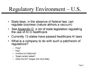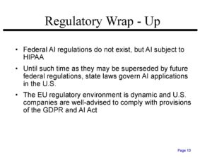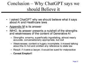 Click on the link below to download the 123 page slide presentation I gave to a consortium of pharmaceutical executives on the regulation of AI in healthcare applications. It discusses federal and state regulations, or lack thereof in the United States, and European Union initiatives, including the GDPR and the AI Act that impact the use of AI technology in healthcare. I also discuss tort liability for the hallucinogenic ramblings of AI gone mad, the more subtle AI omission of facts, and for AI bias. As a bonus, the next-to-last exhibit is AI’s self-generated presentation on this subject, followed by AI’s position statement about why we should believe its not-so-great presentation. $25 bonus to the first person who correctly identifies the country of residence of the person who generated the AI presentation!